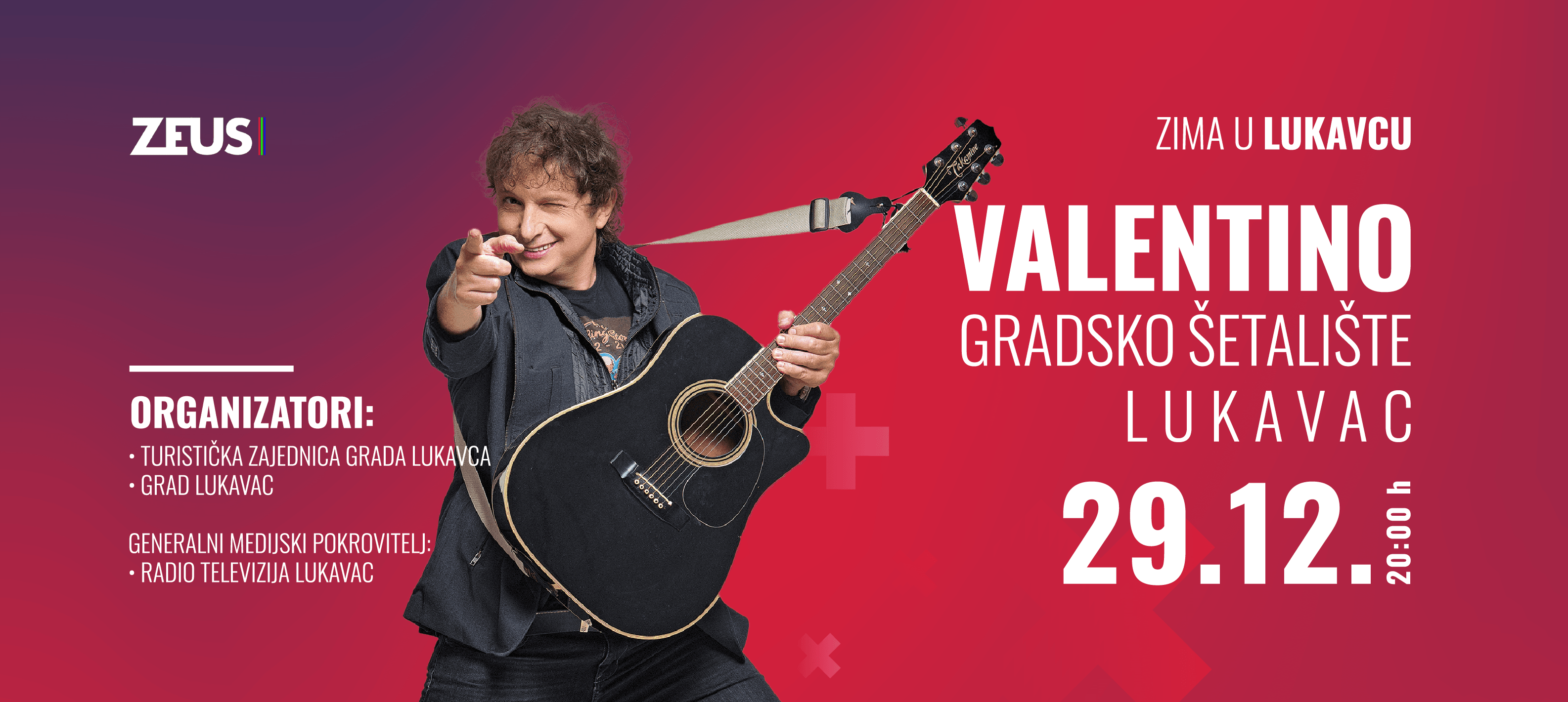Manifestacija “Zima u Lukavcu” donosi građanima Lukavca novogodišnju zabavu za sve generacije. Legendarni Zijo Rizvanbegović – Valentino i njegov bend zagrijaće prazničnu atmosferu i Lukavčanima ponuditi muzičko putovanje kroz dugogodišnju bogatu karijeru i bezvremenske hitove.