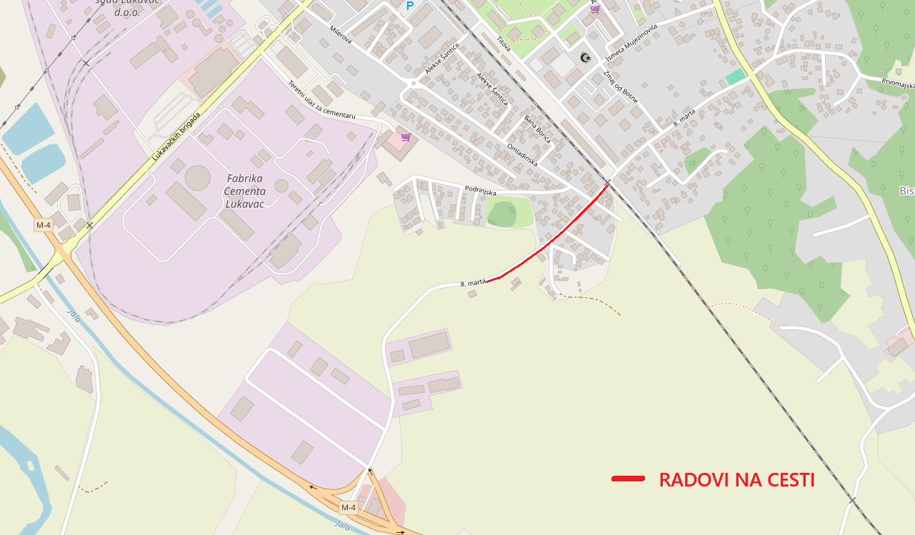 Obavještavaju se građani o privremenoj izmjeni režima saobraćaja u dijelu ulice Osmog marta (lijeva saobraćajna traka iz pravca pružnog prelaza do magistralne ceste M4) u smislu sa dvosmjernog na naizmjenično odvijanje saobraćaja zbog izvođenja građevinskih radova po ugovoru za sanaciju dijela ulice Osmi mart od pružnog prelaza do magistralnog puta M4.