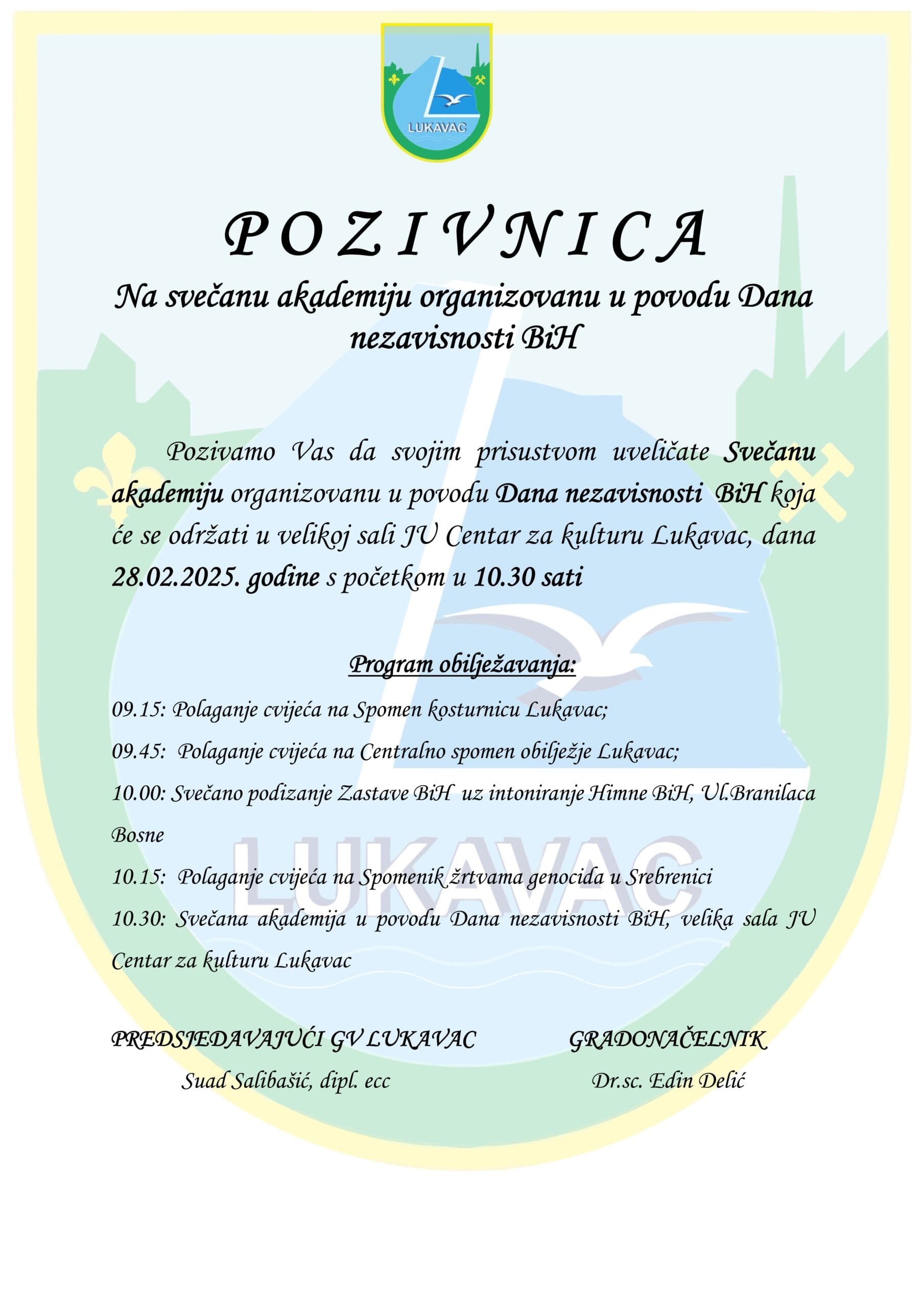 Pozivnica za Svečanu akademiju povodom Dana nezavisnosti BiH