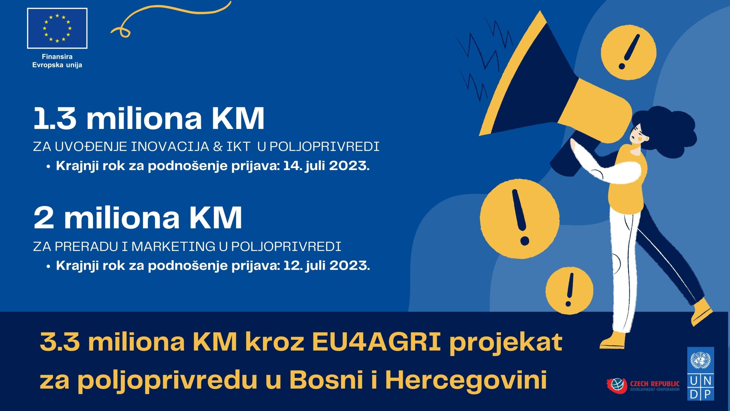- Javni poziv potencijalnim korisnicima bespovratnih sredstava za mjeru podrške investicijama u prerađivačke kapacitete i marketing poljoprivredno-prehrambenih proizvoda, vrijedan je 2 miliona KM.